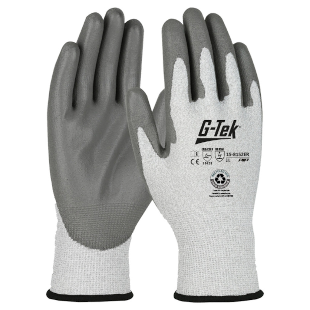 A G-TEK 3RX PU tenyérmártott munkavédelmi kesztyű újrahasznosított PET-palackból és elasztánból készült, varratmentes, finom kötésű alapanyaga kiváló tapadást, kopásállóságot és kézügyességet nyújt kisebb alkatrészek kezeléséhez és szereléshez.
